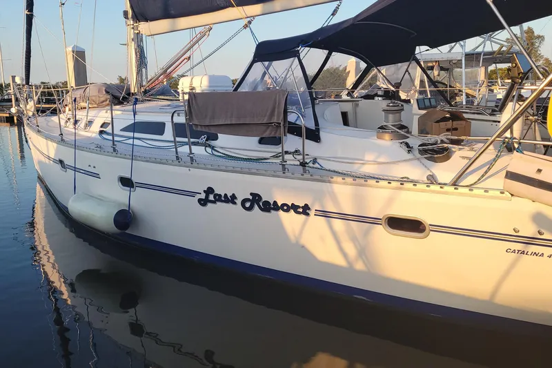 Introducing the 1999 Catalina 470 LAST RESORT, a remarkable cruiser that embodies elegance and performance. With an overall length of 47 feet, this vessel is designed for both comfort and adventure on the water. The sturdy fiberglass hull features a bulb keel, ensuring stability and smooth sailing. Powered by a reliable Yanmar 4JH-TE diesel engine, delivering 76 horsepower, the Catalina 470 achieves a cruising speed of 8 knots and a maximum hull speed of 10 knots, making it perfect for leisurely voyages or spirited excursions. Accommodations include two cozy cabins and a well-appointed head, providing ample space for relaxation. The electric windlass enhances convenience during anchoring, while the generous seating capacity of 8 ensures that friends and family can join in on the fun. The LAST RESORT is a perfect blend of comfort, performance, and style, ready to take you on unforgettable journeys across the water.