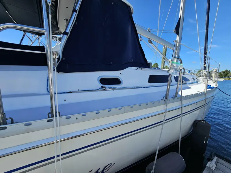 In 2004, she sustained storm damage during Hurricane Ivan, including new gelcoat. Repaired under insurance with no residual damage.