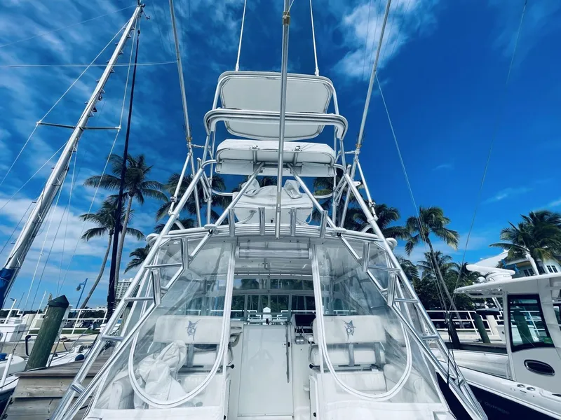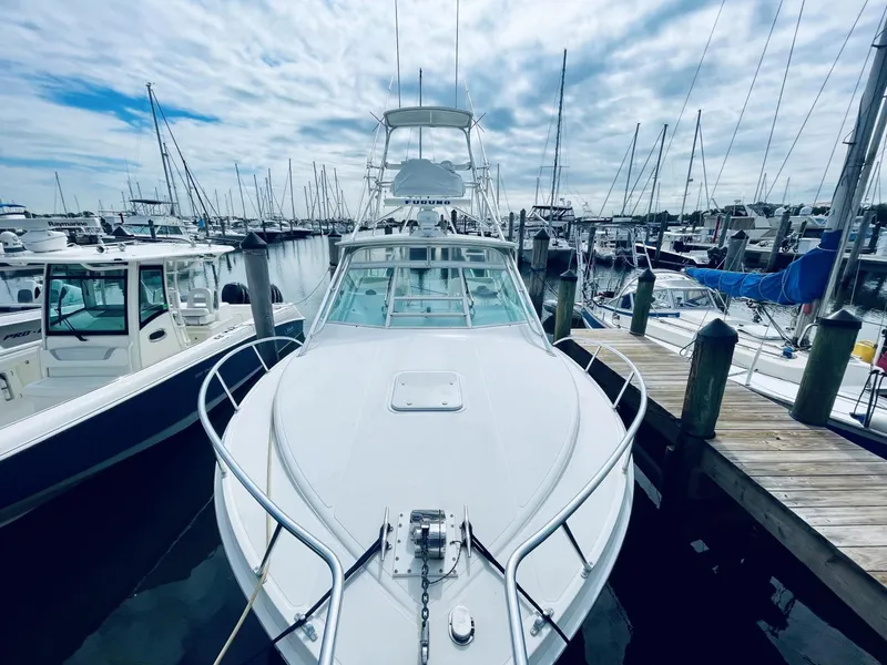 The Cabo 31 is a premium offshore express whose precise handling, exceptional range, and superb engineering set her apart from just about everything in her class in the mid 90s. Heavily built on a modified-V, a wide 12'5" beam gives the Cabo 31 the cockpit and interior space of many larger vessels. Standard features include an integral bow pulpit, bait prep center with sink, transom livewell, in-deck fish box, cockpit rod storage, fresh/raw-water wash-downs, gunnel rod holders, transom door with gate, power windshield vent, cockpit bolsters, cockpit rod storage, trim tabs, and cockpit lights. The entire helm deck lifts hydraulically for engine access. Below, the Cabo's well- appointed interior sleeps four and includes teak cabinets, teak- and-holly flooring, full-service galley with Corian counter, standup head/shower, and convertible dinette forward, and boosts a salon head room of 6'9". The attention to detail found throughout is exceptional. The Cat 350hp diesels will cruise the Cabo 31 in the high 20s.
