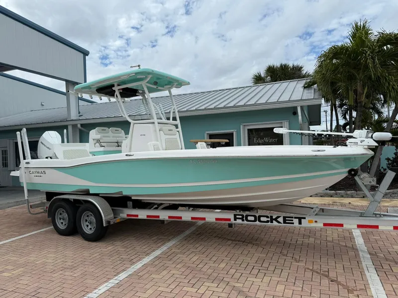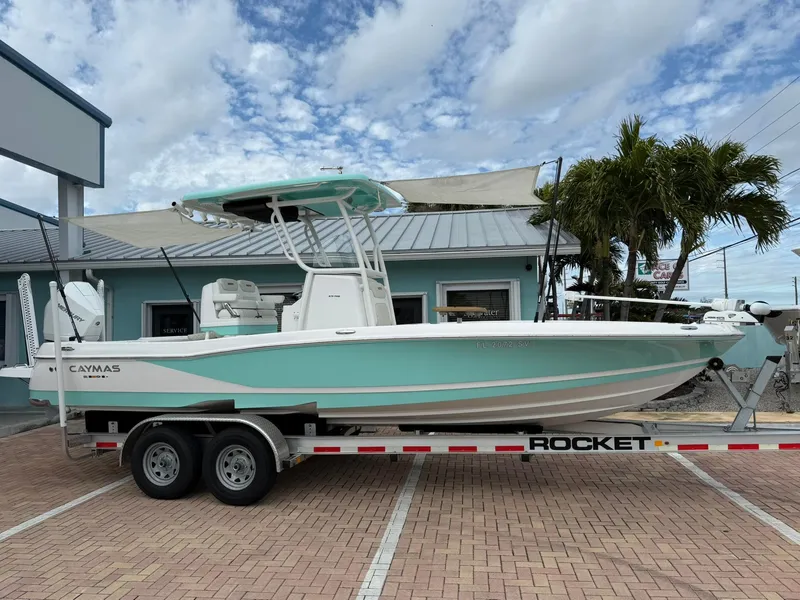Pre-Owned 2021 Caymas 26 HB with custom bow and stern shade kits and a custom fit Rocket aluminum trailer.
