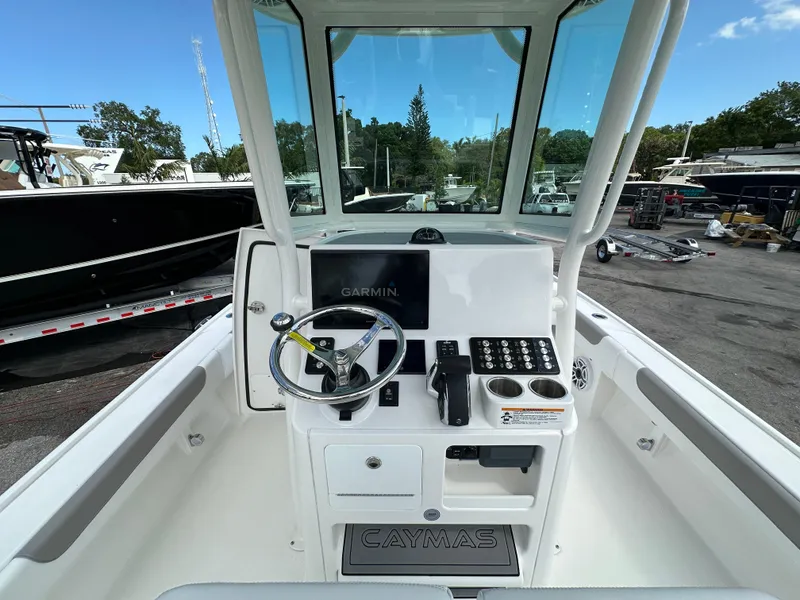 IN STOCK 2024 Caymas 26HB, Equipped w/ Mercury Verado 400 V-10 Cold Fusion, Full Hull Color Upgrade Bay Blue, Garmin GPSMAP 8616xsv at Helm, Minn Kota RT Ulterra, Minn Kota Charger, Trolling Motor Batteries, Trolling Motor Plug and Quick Release Trolling Motor Mount, Motorize Battery Switches, Battery Parallel, 2 Bank Charger for Engine and House Battery, and Voltage Display, Flush Mount SS Rod Holders, Fiberglass Hard Top w/ Custom Powder Coated Frame in White, JL Audio MM50 Stereo and (8) JL Audio 6.5" M3 Speakers, 7 Rod Holders, Electronics Box, Dome Lights, 3 LED Spreader Lights and PFD Storage, MM100 Head Unit, (4) 6.5" M6 Speakers, 2 Amps, Port Livewell w/ 800 GPH Pump and High Speed Pick Up, Gray Surf Turf Mats in Place of Standard Teak Color on Cooler, Helm Step Pads, and Helm Storage Pad, White w/ Grey Accent Complete Upholstery Package, Power Pole Blade Series 8', Fresh Water System, 3 Sided Glass Enclosure Integrated into Hardtop Frame, Leaning Post Drawer and Cutting Board, Underwater Lights, GEMLUX Hardware Upgrade, and so much more!