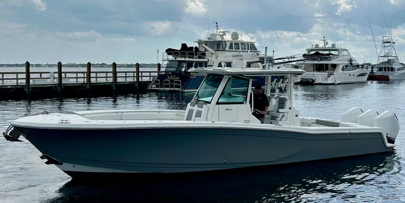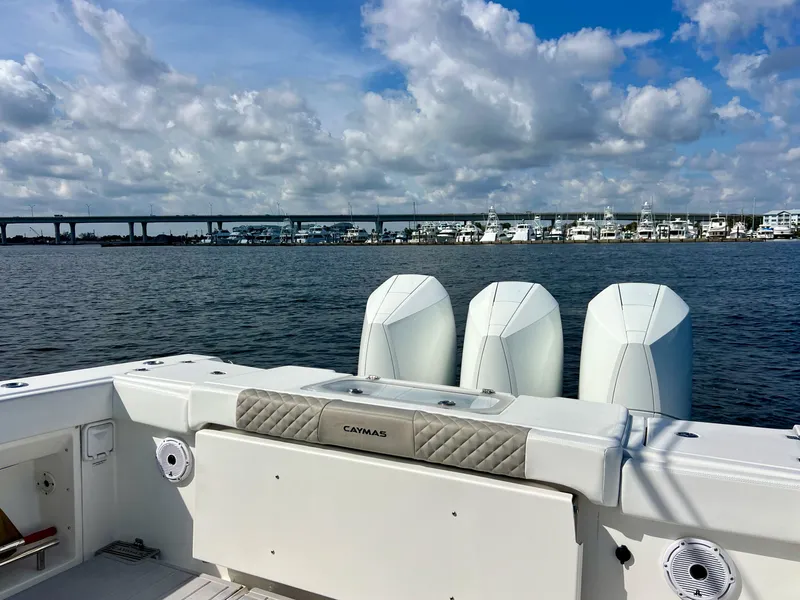 The 2021 Caymas 34 CC is praised for its smooth ride, impressive handling, and ample fishing features, including a well designed console inside, Mercury power, and Garmin electronics. Owners highlight its performance capabilities, with speeds exceeding 50 mph, and its comfortable design for both fishing and family outings. It features a unique Michael Peters SVVT hull design that enhances performance and stability.