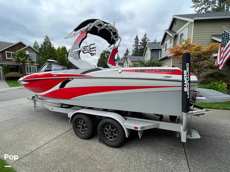 This model is powered by a PCM V8 engine with 409 HP, and includes includes Centurion's Ramfill ballast system, which fills and drains large ballast tanks quickly using gravity-fed valves. In combination with plug-and-play ballast bags and the QuickSurf Pro system, the boat allows for real-time wave shaping with adjustable wake characteristics on either side. The Stinger Wake Plate further refines wave shape and running attitude.