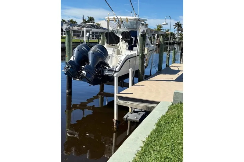 The spacious walkaround layout provides secure bow access, a comfortable cabin, and a well-equipped helm. Whether you're heading offshore to fish, cruising with the family, or planning an overnight trip, this boat is ready for it all.