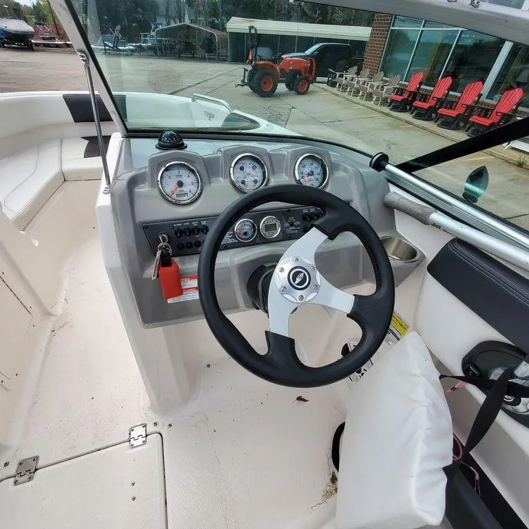 Built in Cooler (70-Quart) Under Rear Bench Seat Cockpit Drainage System (CDS) Cockpit Grab Handles - Stainless Steel Cockpit Layout: Two Bucket Seats (Slide and Swivel) with Logo Badging, Rear Bench Seat and Aft Hinged Sundeck with Walk-Thru & Lounge Position Custom Designed Ultra Comfort Helm Seats Diamond Pattern Non-Skid Fiberglass Molded Bowrider Area with Storage Underneath Full Size Wraparound Walk-Thru Windshield with Custom Stainless Steel Supports Interior Color Packages: Black, Biscayne Blue, Fire Red or Yellow Lighting - Aft Cockpit Courtesy Lights (4 - LED) Molded Glove Box Storage with Foam Protectant Pad Molded-In Footrest - Port and Starboard Premium Expandable and Stain Resistant Cockpit Upholstery Vinyl with Nano-Block Technology Premium Sound System: Sirius Satellite Ready, AM/FM CD Player and MP3 Jack Side Panels with Coaming Storage Ski Storage in Floor with Large Hinged Fiberglass Hatch and Rubber Mat Stainless Steel Drinkholders (8) Starlite Seat Cushions with Water Drainage System Storage Underneath Starboard Dash Water Resistant Speakers (4)