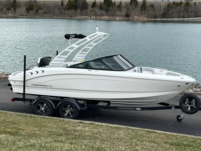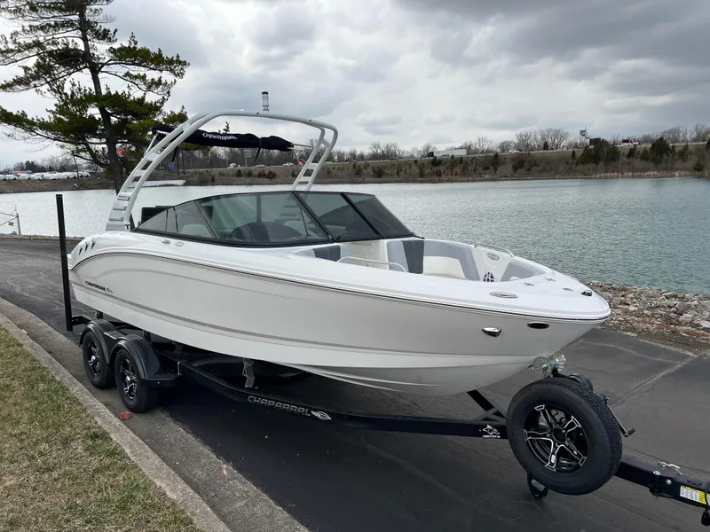 Great looking 2025 Chaparral 21 SSi! Whietout exterior, Mercruiser 250hp motor, easy to fold tower w/ bimini top, upgraded 9in Simrad GPS/depth finder/engine gauges, rear stereo remote, rear flip up seat backs, bow filler cushion, blue LED speaker lights, tandem axle trailer w/ spare, and more!