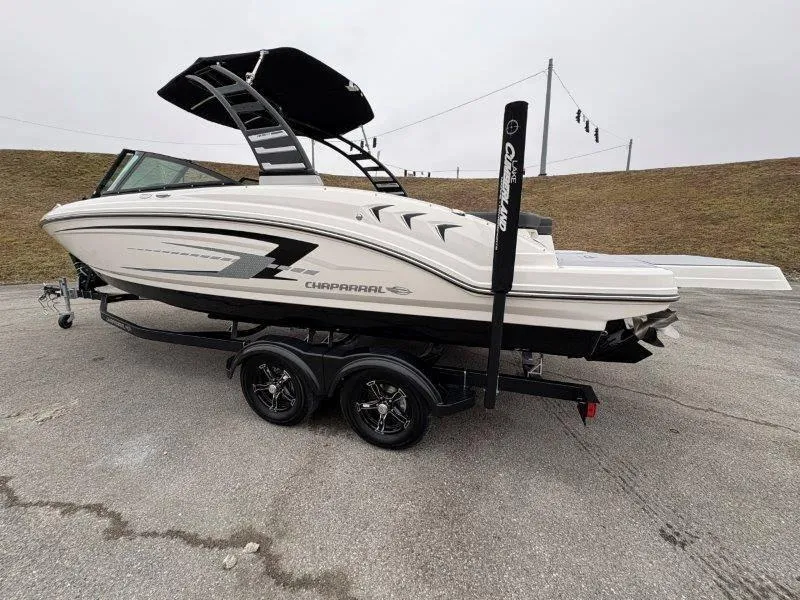 2025 Chaparral 23 SSi Sport, 2025 Chaparral 23 SSi Sport 5-Year Premium Level Limited Component Warranty • Battery On/Off Switch • Built-In Cooler (70 Quart) Under Rear Bench Seat • Cockpit Drainage System • Deep Freeboard • Dual Walk Thru Transom w/Hinged Chaise Lounge • Extended V-Plane Hull • Forward Anchor Locker • Full Complement of Color Selections - Standard • Full-Height Wraparound Windshield • Glare Resistant Fiberglass Helm Station • Integrated Swim Platform • Limited Lifetime Hull Warranty • NMMA Certified • Powder-Coated Tandem Axle Trailer with Swing-Away Tongue • Premium Envision Marine Silicone Upholstery • Premium Gelcoat and Hydropel Resin • SIMRAD GO7 Touch Chartplotter/Fishfinder with Engine Data and Audio Controls • Stainless Steel Rubrail and Grab Handles • Ultra Comfort Premium Bucket Seats with Flip-up Bolsters • Water Resistant Circuit Breakers •Hull Side Gelcoat - White •Hull Bottom - Black •VX Sport Graphic - Black/Alloy Gray •Cockpit Interior - Sterling •Standard Canvas - Black •Folding Velocity Arch Tower - Black •Cockpit and Bow Cover •Includes Digital Depth Gauge, Bimini Top with Boot or Tower Top •Canvas, Ultra Comfort Pedestal Seat with Flip Up Bolster for Helm & Passenger, Port Console Storage Door and Deluxe Badging •Simrad GO9 Touch Multifunction Chartplotter/Fishfinder •Snap-In Seadek Cockpit Flooring - Slate •Seadek Swim Platform Mat with Extended Swim Platform •Clarion Transom Remote •Anchor - Galvanized •Black Bonded Windshield •Dual Battery Setup with Crossover Switch •Extended Swim Platform •5 Year Premium Level Limited Component Warranty •Docking Lights •Trailer - Black Tandem Axle with Aluminum Wheels •Spare Tire Kit - Aluminum Wheel