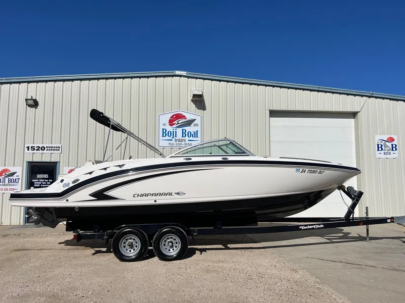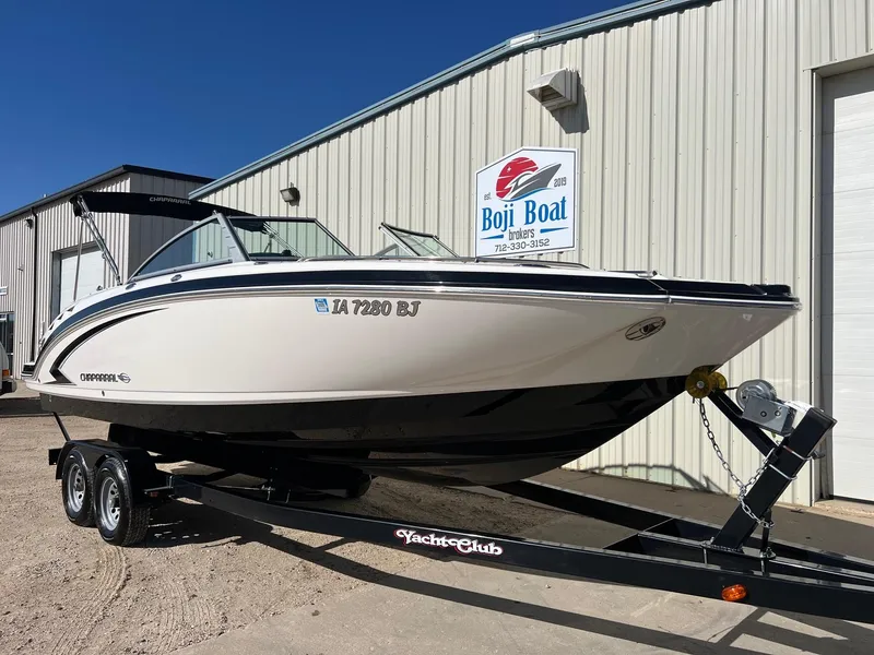 This model is perfect for families or groups looking for a reliable and stylish boat for leisure activities. This Chaparral comes sitting on a 2018 Yacht Club tandem axle trailer.