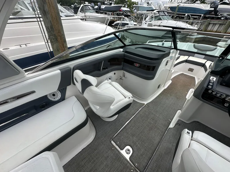 The 267 SSX is a trendsetter in design, performance, and function. The helm features an all glass dash with dual touch screen displays. The cockpit is open, spacious and features a multi-position sun lounger aft. The open concept design carries forward into the bow area which features hinged storage beneath luxuriously appointed upholstery. Chaparral went to great lengths to create a powerful and agile craft that glides through the water with minimal noise.