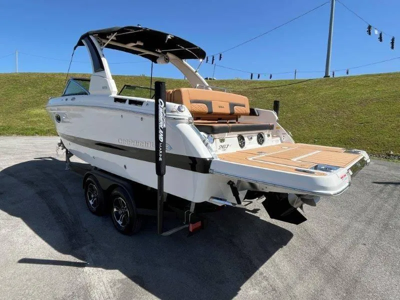 2024 Chaparral 267 SSX, 2024 Chaparral 267 SSX ALL ABOUT THE DETAILS Look no further. The redesigned 267 SSX is breaking barriers and setting the standard in quality. Equipped with state-of-the-art dual multifunction 7" Simrad displays within the easily accessible helm for improved ergonomic navigation. Sporting a spacious cockpit with standard u-shaped aft seating that leads back to the standard Infinity Power Step swim platform that provides an unparalleled reboarding experience. The 267 SSX was designed to captivate with no compromise to power or performance. OPTIONS Mercury 8.2L DTS 2.00 Bravo 3X 380 HP Catalyst Hull Side Gelcoat - White Hull Bottom Gelcoat - White Painted Metallic Hull Stripe - Black Cockpit Interior - Cayenne Canvas Color - Black (If Equipped) EFX Electric Folding Arch Tower - Black Bow Canvas Sky Shade - White Cockpit and Bow Cover JL Audio Sound System Upgrade Connectivity Package Pump-Out Porta-Pottie Infinity Power Step Mat - Cayenne Snap-In Seadek Cockpit Flooring - Cayenne Anchor - 12lb. Galvanized Dual Battery Charger 5 Year Premier Level Limited Component Warranty Trailer - Black Tandem Axle with Aluminum Wheels and Bow Ladder Spare Tire Kit - Aluminum Wheel UNIQUE KEY FEATURES 5 Year Premier Level Component Warranty Aft Bench Seating with Reversible Backrest System Cockpit LED Lighting Custom Leather Steering Wheel with Protective Cover Enclosed Fiberglass Head Compartment Extended V-Plane Hull with Kevlar Reinforcement Hand-Stitched Interior Upholstery Infinity Power Step Limited Lifetime Hull Warranty NMMA Certified using ABYC Standards Power Assisted Steering with Tilt Wheel Premium Bucket Seats - Port and Starboard Premium Gelcoat and Hydropel Resin Premium Stain Resistant Silicone Cockpit Fabric Self-Bailing Cockpit with Integrated Drains Simrad NSS12 EVO3S Chartplotter/Multifunction Display Stainless Steel Transom Shower Storage Under Helm with Protective Mat and Trash Receptacle Trim Tabs with Indicator Lights U-Shaped Aft Cockpit Seating with Double Arm Hinged Cushions Water Resistant Speakers (8), with Blue LED Lighting