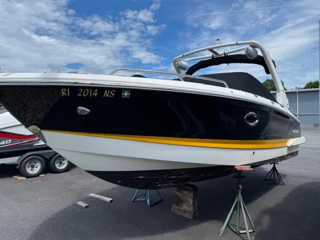 The Exterior color of this boat is Wide Band Black/White with a Yellow Boot stripe, Cockpit Interior color is Slate with Black Canvas.