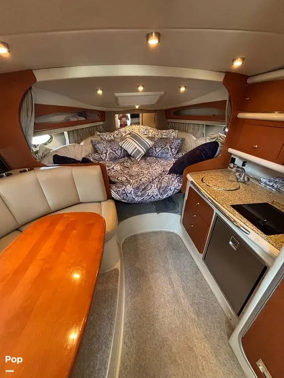 The cockpit is arranged for both cruising and entertaining, featuring a wraparound lounge, a comfortable helm with clear visibility, snap-in carpet, and direct access to the swim platform through the transom door. Below, the cabin feels open for its size, with clean finishes and a functional layout. The forward berth converts easily via the power-assisted table system, and the mid-cabin adds additional sleeping accommodations, allowing the boat to sleep up to six. Two televisions are installed for onboard entertainment. The galley is equipped with a microwave, cooktop, refrigerator, and storage for weekend or extended cruising. The enclosed head offers a sink, toilet, and pull-out shower.