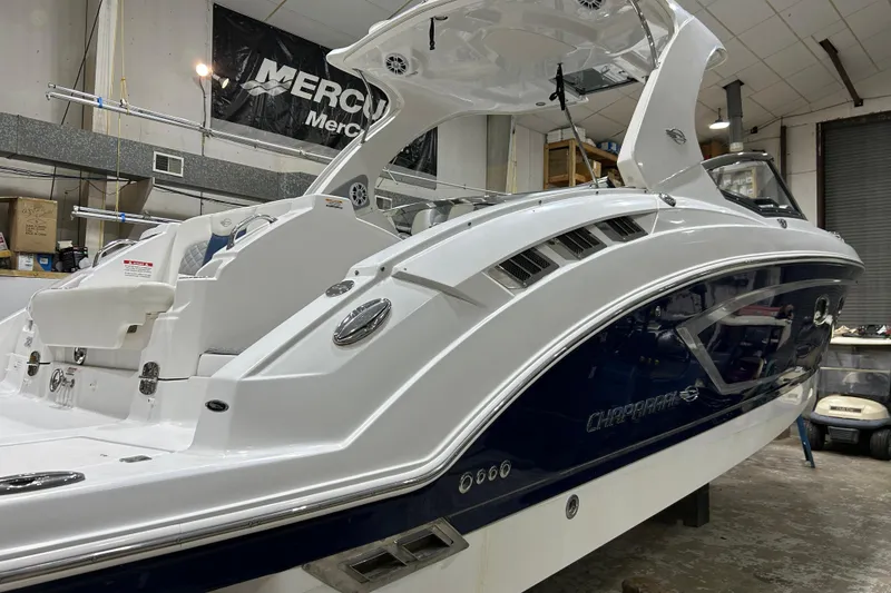It's part family bowrider, part performance-minded sport boat, part overnight cruiser but most importantly the incredible 327 SSX is a Chaparral through and through. Powered with Twin Mercury 8.2 engines and Bravo 3 outdrives. Both engines were just fully serviced and gone through full inspection. New transom assembly's, all all new exhaust, Garmin 5208 GPS/Sonar combo, Fusion Stereo, Underwater lights, electric trim tabs and LOW hours of 507. This excellently maintained Chaparral has just received a complete Re-Fit from bow to stern. Looks like New! Call Schrader Yacht Sales Today!