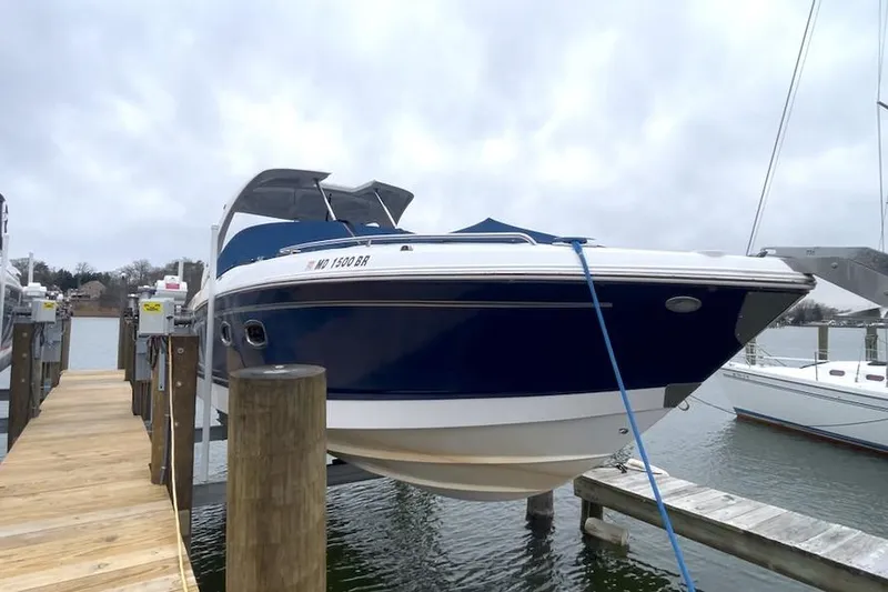 The 2013 Chaparral 327 SSX is a 32-foot 7-inch luxury bowrider/cabin hybrid with a 10-foot beam, 22-degree deadrise, and ~10,200 lb. displacement. It features a unique cabin layout with twin berths, a stand-up head, and a large, versatile cockpit designed for entertainment. Her sturdy hard top structure protects you from UV rays and inclement weather. Twin MerCruiser 5.7L 350 Mag engines with Bravo III drives and get you to where you want to be and back safely.