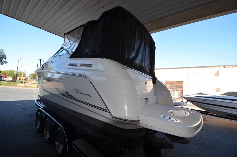 27' 2000 Chaparral 270 Signature, twin 190 HP, Mercruiser, engine hours TBD, raw water cooled, Alpha drive units, Marine Air, reverse cycle A/C unit, Galley down with under counter Norcold refrigerator, single burner stove, large sink, Vee Berth table converts to berth sleeps two, mid cabin double berth sleeps two, bimini with full enclosure camper top, extended swim platform, boarding ladder and triple axle bunk trailer.