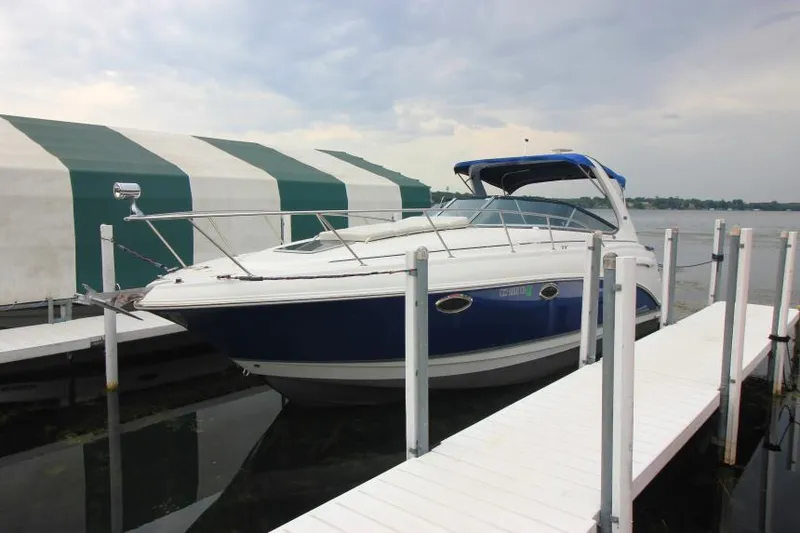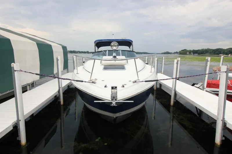 Twin Volvo 5.0L OSI engines w/Only 328 hours (The engines are ones that can be used in saltwater - these ones have only been in fresh water) Kohler generator w/Only 264 hours, AC/Heat, cockpit cover, bimini top, snap in/out "Better-than-teak" cockpit flooring, windlass anchor, upgraded Fusion marine stereo w/cockpit speakers, transom speakers, amplifier + subwoofer. Battery charger, Smart TV, full galley w/Refrigerator, microwave, stove, + sink. Extended swim platform w/Ladder, cockpit wetbar w/Sink, cockpit table, bow sun pad cushions, remote spotlight, private head w/Vacuflush toilet, V-birth filler cushion, transom shower, and more! This boat is fully loaded with great upgrades! As photos show, this boat has been very well taken care of inside and out. Always indoor stored during the fall/winter. Fresh water only! Call to schedule an appointment to view this beauty!