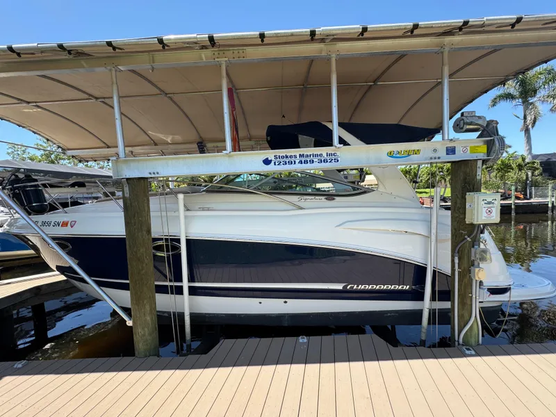 Freshwater boat until 2023! Chaparral Signature in very nice condition. Volvo-Penta 5.0 GXI Duo-Prop's with only 450 hours! Gelcoat is very shiny and all upholstery is in great shape. Cabin is super clean. Boat has always been kept on a covered lift since coming to Florida in 2023. Nice boat!