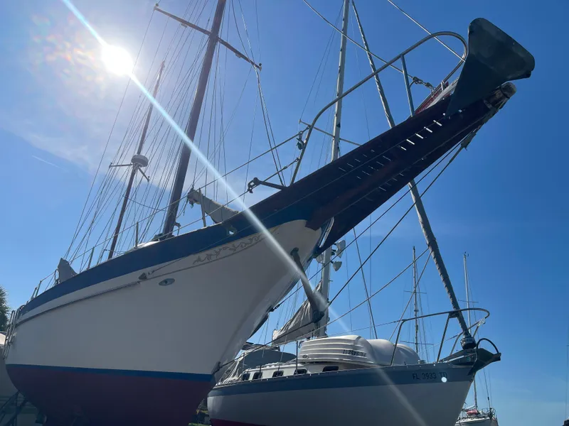 This staysail rigged ketch provides for a sail plan option for any sea condition. Her low shear and long keel mean she won't fight you on tough days, and she'll do what you tell her on most any point of sail.