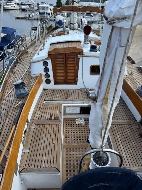 The saloon is an 18' long, nearly wide-open cabin that provides sleeping accommodations and seating for 6-8 at an 8' diameter dinette. The enclosed berths in the fo'c'sle are accessed by removing a panel in the dinette back where the berths are laid out in a "toe-over-toe arrangement," the port berth being higher than its counterpart. On the port side the navigator has a large, hinged chart table and forward of that is counter space and then the u-shaped galley equipped with a stainless steel sink, a gimbaled alcohol stove and oven and a freezer/refrigerator below a counter. There's an abundance of storage cupboards and shelves. To starboard is the head/shower combination with access from both the main saloon area and the aft cabin/quarterberth. The aft cabin is equipped with cabinets and shelves. This particular vessel had the port quarterberth with the usual double berths, upper and lower, converted to a storage space and providing extend counter space and more room for the nav station