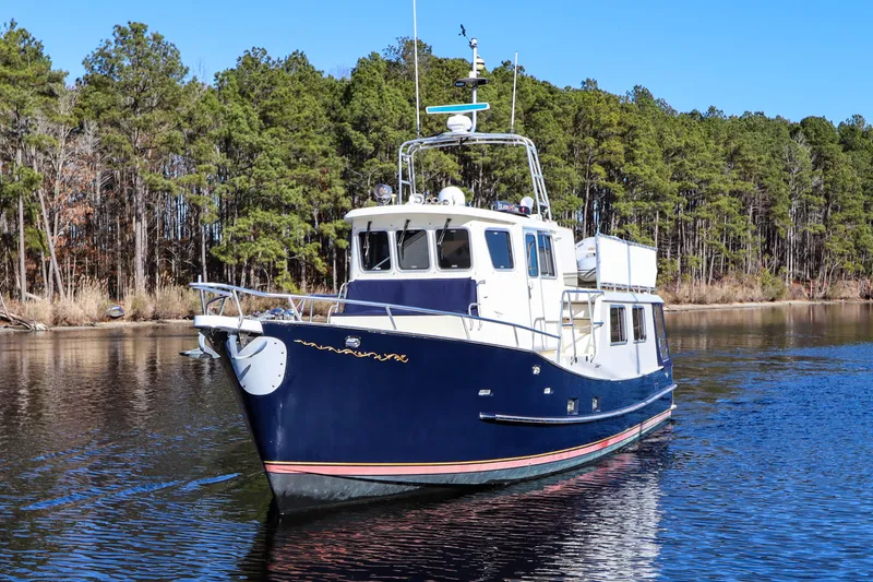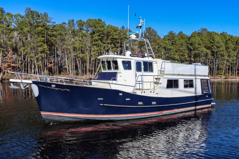 From the Great Loop to the turquoise waters of the Exumas, this American-made, single-engine pilothouse yacht is built for long-range cruising and liveaboard comfort. Designed by Gary Grant and James Backus and expertly crafted by the Cherubini yard in Delran, NJ, this vessel features a form-stable hull with a long keel, molded-in stringers, and a hard chine aft-eliminating the need for stabilizers. Powered by a dependable Cummins 450hp 8.3L 6CTA Diamond diesel engine, she offers an impressive range of approximately 1,800 nautical miles at 7.6 knots, sipping fuel at just 4.5 GPH.