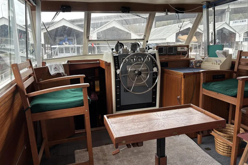 The design is retro-classic and interior and exterior trim details abound that enhance the appeal of this well-kept vessel. Being boathouse-kept the exterior is in good condition overall with minor gelcoat wear showing in spots and some brightwork refinishing is needed. During this era of boat building in Glass Reinforced Plastic (GRP - fiberglass) construction was typically hand laid to a heavy build up of material layers making these boats especially tough.