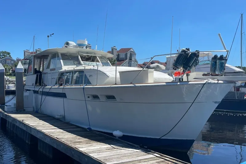 Introducing the elegant 1969 Chris-Craft 47 Commander, a classic motor yacht that embodies timeless craftsmanship and performance. With an overall length of 47 feet, this vessel is designed for both comfort and adventure on the water. The robust fiberglass hull ensures durability and stability, making it an ideal choice for cruising. Powered by twin Detroit 8V53 diesel engines, each delivering 283 horsepower, the yacht promises a reliable and powerful performance. With a total of 1498 and 1479 hours on the engines, it has been well-maintained, ready for new journeys. Accommodations include three inviting cabins and two heads, providing ample space for relaxation and privacy. The yacht is equipped with essential features, ensuring a seamless experience on the water. The Chris-Craft 47 Commander, named "Wastin Away," is perfect for those seeking a blend of luxury and adventure in their nautical pursuits.