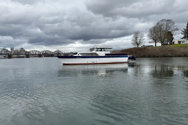 Three staterooms, three heads, full complement galley, newer generator, new teak decks, all hardware re-chromed. Electronics include Furuno radar, autopilot, various meters, windlass, dinghy davit, trim tabs. Nick Jackson davits. 11' rib tender with console and 25-Yamaha. Nice wood floors, custom spun aluminum dash, 2237-original hours on the twin 8v-71 320hp Detroit diesels. Diesel gen installed in 2008. with only 135-hrs. Very spacious with three staterooms, 3-heads with new Techma electric toilets. Fuel tanks have been replaced, and exhaust lines. Rib tender plus outboard and Roskelley davits.