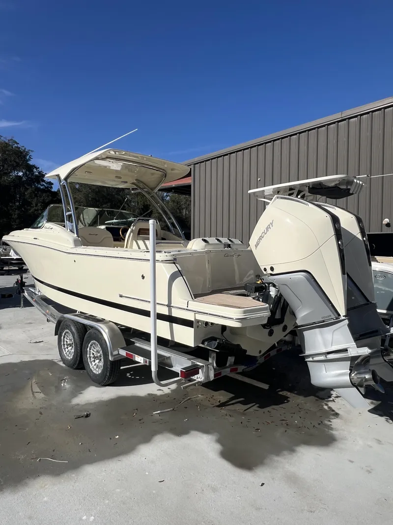 New 28 Calypso Ivory Cream Gelcoat, Mercury 300s with Black Accents, Almond Vinyl Cushions, Pump Out Head, Ski Pylon, Cockpit Galley w/ Refrigerator, Air Compressor, Battery Charging System, Cockpit and Bow Covers, Fender Clips, Premium Audio, Underwater Lights and Windlass with line. Give Reed or Prescott a call with questions! (843) 522-9461.*PRICE ABOVE DOES NOT INCLUDE PREP/FREIGHT AND DOES NOT INCLUDE TRAILER!*The Calypso 28 exemplifies Chris-Craft’s detailed craftsmanship. The bow offers u-shaped seating with customized upholstery made from the highest marine-grade vinyl. The strikingly styled helm comes standard with a flush-mounted 12” Garmin display, glass cockpit, a high gloss teak steering wheel and accents. An adjustable port lounge can lay flat or convert to aft or forward facing seating.