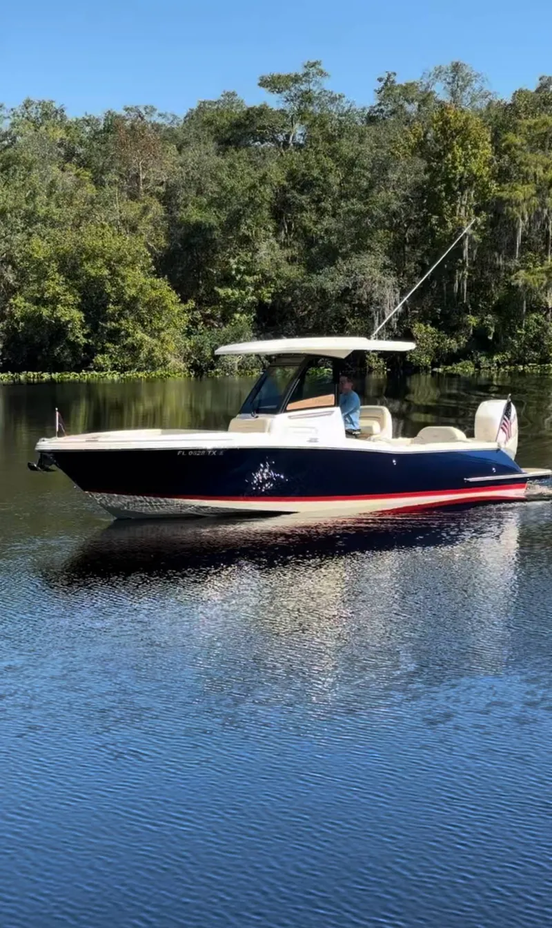 51 HOURS This Chris-Craft Catalina 24 is freshwater kept and has low hours. One of the few outfitted with a 350 Mercury Verado allows for more top end speed and better overall performance. Loaded with options this is the perfect river runner for anyone that wants to do it in style. wit hseating for 10, and a head for those longer trips, this is a great center console for the whole family. A patent-pending reversible helm seat unique to the Catalina 24. In its forward position, the seat is raised for optimal captain visibility. When converted to face aft, the seat creates a comfortable social zone. Integrated into the helm seat are storage pockets on both starboard and port sides, as well as custom upholstery with accents finished in varnished mahogany and stainless steel. Just below the helm seat, a 65-gallon Yeti cooler slides to accommodate the seat's position. This boat does not come with a trailer.