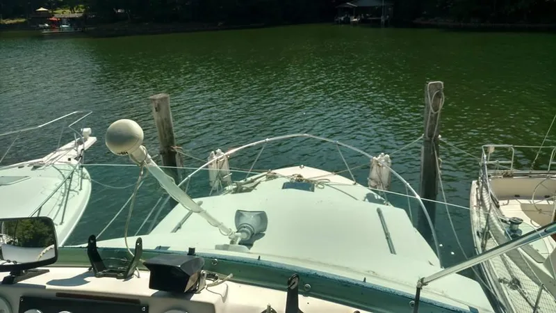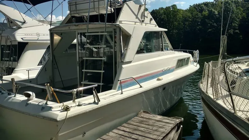 1973 Sedan Bridge 33 with twin 350 inboard Mercruisers. The vessel was repowered in the 1990s and both have been serviced recently and run great. This is a nice restorable boat with lots of potential. Very roomy with a large v berth stateroom which sleeps 2 adults. Large head and shower which is conveniently located between the stateroom and galley. A nice galley and spacious salon with cold air and warm heat. Large sliding glass door opens to large cockpit, perfect for outside seating during a cruise or sitting at the dock. Priced to sell! We are a gated marina so please call for an appointment. One year free slip with full price sale of boat