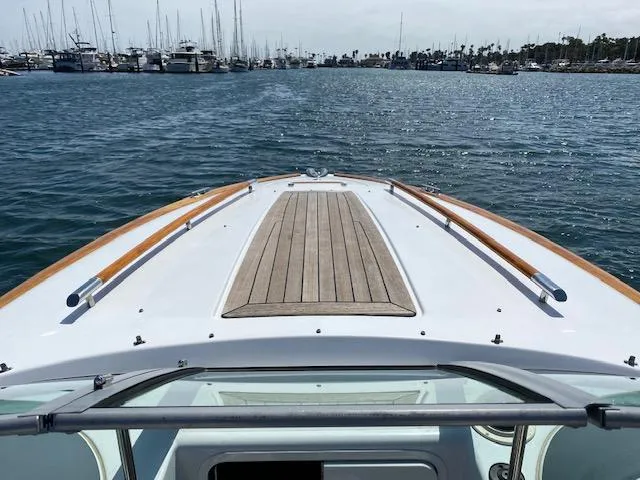 The design is a throwback to the 1950's vintage classic Chris-Craft runabouts. Forward is a small v-berth with a porta-potti nestled underneath. The helm and 1st Mate's seating is swiveled for convenience. Visibility is 360 degrees and the windshield is at just the right height to offer protections at running speeds.