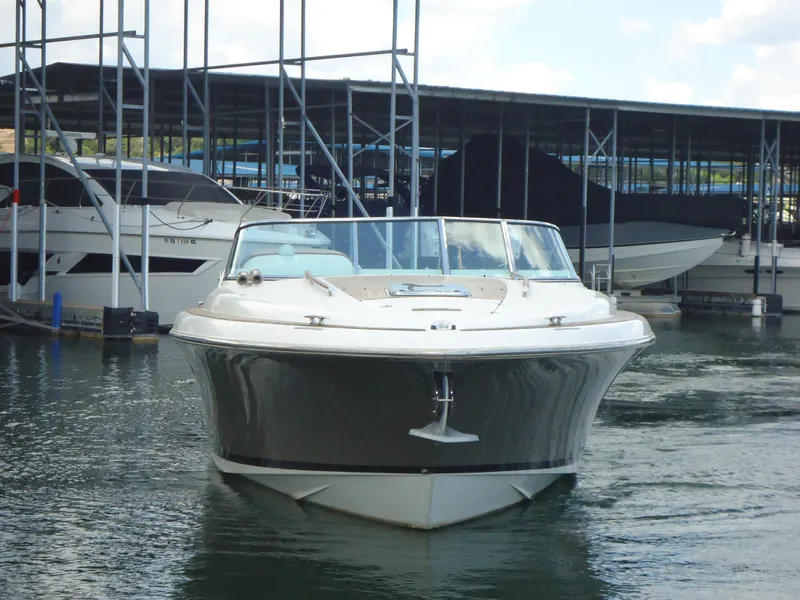 The lines on this boat are classic and show a style and grace that is true to the Chris-Craft name. The cockpit is enormous and can entertain many with the abundant seating. There is a hide away bimini top under the engine hatch, see pictures. The flooring and accents on the deck are all teak. The helm has a classic look mixed in with a large GPS screen. The helm has a double wide seat and the passenger side does as well. There is a wet bar sink with cutting board above the cockpit fridge and a ice maker on the other side.