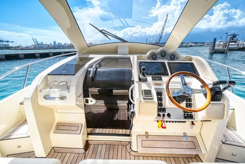 A teak console houses a complete kitchen that performs double duty. Equipped with an ice maker and refrigerator, as well as an outdoor ceramic cooktop and a grill, it's always ready to serve, whether it's a day trip or a week-long stay.