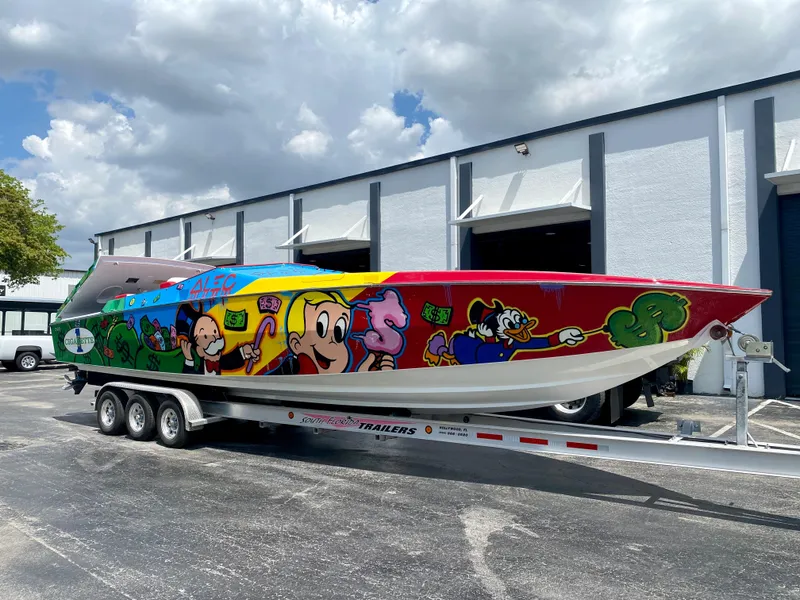 The 1994 35' Cafe Racer Cigarette boat that underwent a full refit in 2023, exudes speed, power, and luxury. It was custom painted by distinguished artist, Alec Monopoly. The boat's exterior is adorned with colorful and splendid designs that will catch everyone's attention. The paint job is not only a work of art, but also adds a layer of protection to the boat's surface. Overall, the 1994 35' Cafe Racer Cigarette Boat 2023 Refit is in its original hull and deck, keeping its authenticity.