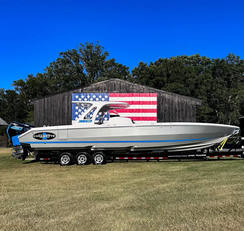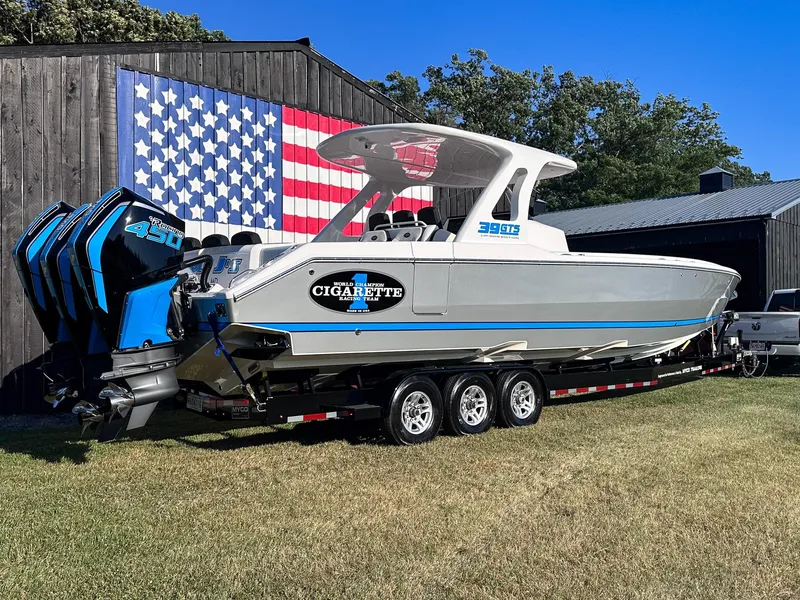 2021 Cigarette 39 GTS Lip-Ship Edition Powered by Triple Mercury Racing 450R's with approx. 285 Hours. Beautiful Myco triple axle trailer included. Platinum Mercury warranty through July 2026