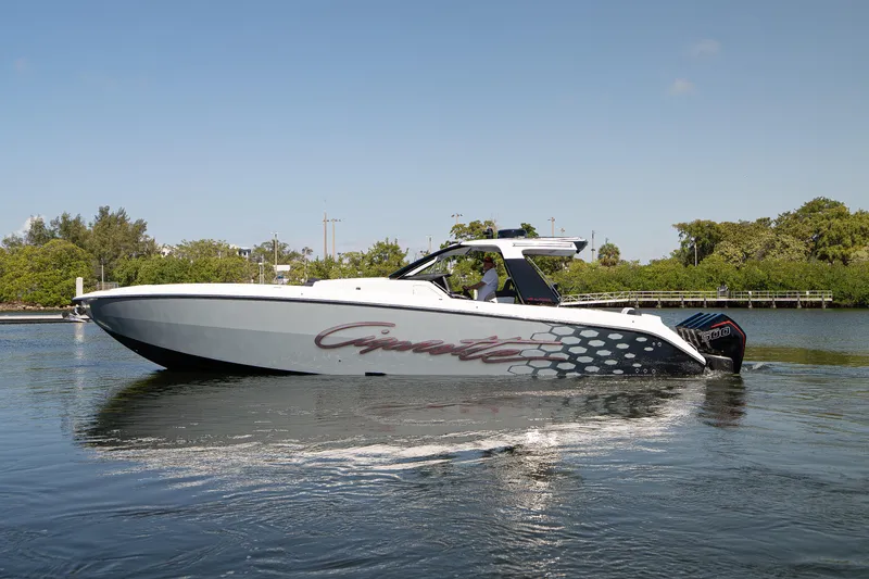 The 2025 Cigarette 42 Auroris is the ultimate expression of luxury performance and offshore capability, powered by quad Mercury Racing 500Rs and crafted with Cigarette's legendary attention to detail. Her striking two-tone gel coat with custom paint, white hardtop with flair wings, and stainless steel rub rail make a bold statement on the water, while telescoping aft sunshade and sea deck flooring add practicality and comfort.