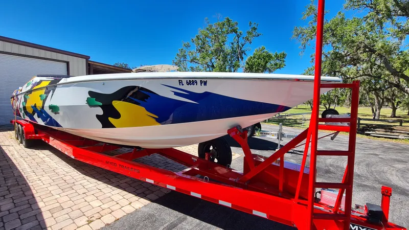 Go fast and look good! You can reach speeds over 90 mph in this 42' classic Cigarette Racing Team speedster! She is powered by a super charged Innovation 900 HP engine with #6 drives, only 25 hours of use. At the helm, there are color coordinated Gaffrig gauges, a Garmin GPS and bolster seats. Hidden under the steps to the bow is a spacious cabin with v-berth and salon; the salon seats have been lowered to allow for more headroom. The cabin has two hatches, a cooler, and plenty of storage. There is a battery charging system and cockpit cover. Comes on custom Myco 3-axle aluminum trailer with electric brakes.