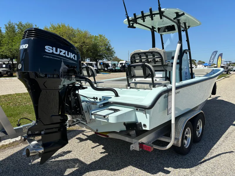 2024 Clark Sound 24 Open Suzuki 300 Float-On Tandem torsion Aluminum trailer with Hard-top powder coated Black Aluminum w/rodholders, Hardtop Underside matching gelcoat, Custom Color Gelcoat Aqua Mist, Dual Battery with Disconnect switch, Garmin GPSmap 8616 XSV, Garmin GT56UHD-TM 350W transom mount transducer, JLAudio Platinum Pkg, Bolsters (fwd/mid/aft), Anodized Transom Jump seat Backrest (P & S) w/2 rod holders, Cooler slide, additional K2, Glacier White Leaning post tackle unit, ZIP WAKE trim tabs, Atlas 6" jack plate, pressurized aerated live wells, Phone Charger, Raw and Fresh water washdown, extra raw water at anchor locker, 2 additional kingfish rod holders, Custom swim platform w ladder, 2 additional SS cupholders, MinnKota 72" 112 lb 36V w/Abyss 36V 60 ah Lithium Battery, on-board lithium battery charger.
