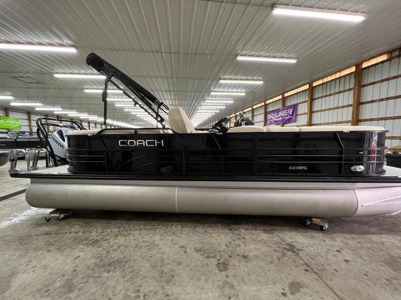 2022 Coach 243 RFC 3-SERIES TRITOON, FINAL CLEARANCE ON LUXURY TRITOONS - SAVE $36,193 MSRP $104,181 > SALE PRICE 68,227 + tax, title & reg New 2022 Coach 243 RFC 3-Series High Performance Tritoon in Black Out Scheme, with RGB Lighting Package, "Deluxe Package" including 10 upgraddes, including Raised Helm, Black Acrylic Table, Subwoofers, Digital Gauges and Power Steering with a BF 150 Hp Honda Motor For Sale at Fay's Marina LaPorte Indiana 46350 Upgrades include: High Performance Tri Toon Package, Power Assist steering pump, Black Out Package, Deluxe Package, RGB Under Deck & Under Water Lighting Package, Quick Release Fender System, Black Fence, Portable Cup Holders, Honda Pre-Rig Controls, 5-Year Vantage Protection Package, Pro Ski Tow Bar, Honda BF 150 HP Motor THE DELUXE PACKAGE UPGRADE elevates your Coach to the Next Level with: • Raised helm w/marine mat flooring • Gussi Italia Lessinia Steering Wheel • Stainless Steel Flip-up Cleats • 2 Subwoofers • Black Acrylic table • Autochrome "Coach" Logo • High Back Reclining Helm Seasts w/ Accents • RGB Interior Lighting and Exterior Under Deck and Underwater lighting Stk# 4483 No trailer included in sale price. Exterior Color: BLACK | Interior Color: TAN | Body Style: TRITOON