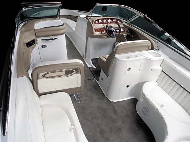 The Cobalt 282 is as responsive to the captain as it is to her guests. For all its size and spaciousness, the 282 handles with the agility, and nimbleness of a far smaller craft. Even so, sheer volume remains a principle 282 virtue: large storage opportunities include dedicated fender lockers, a gigantic head compartment, a motor box ready to accept twin-power options (choices that will make the 282 something of a rocket), a big swim platform, a double-wide helm seat, and an artful design for an imposing hull that delivers a splendid ride in rough water. Standard equipment includes a sound system, a galley unit with sink, wrap-around seating, and a pump-out Porta-Potti.