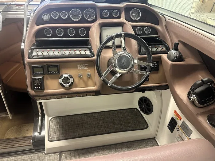 The spacious cockpit layout has plenty of seating for friends and family. Featuring an innovative flip-out cocktail table that stows in the port sidewall, adjustable back rests and a large rear sun pad that overlooks the extended swim platform. Behind the captain's seat you'll find a deluxe wet bar with sink and refrigerator. Snap-in weave carpet and elegant wood trim accents to tie the whole design together.