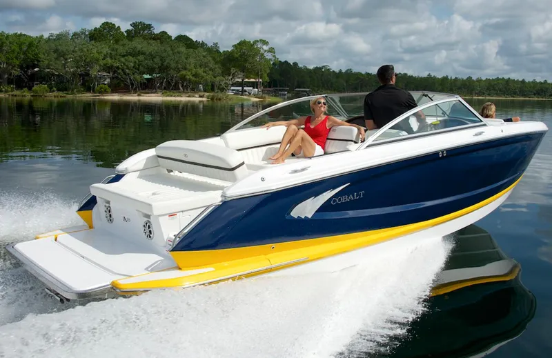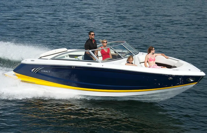 The A25's hull required a five-piece mold to make, a no-shortcuts exercise in hand craftsmanship leading to lines at once inverse, elegant, and unprecedented. The A25 represents genuine innovation, deep-down improvements far beyond a glamorous first impression. The A25's design creates the running surface of a much larger boat, with consequent reduced bowrise at acceleration, more stability in turns, and even more comfort at cruise for all aboard. Knowledgeable boaters will recognize the new features specific to more enjoyable days on the water, from the available deployable swim platform and transom speakers to the digital instrumentation at the helm, from easier access at the stern to all new, from easier access at the stern to all-new fender storage forward. Know the guiding hand of Cobalt imagination. On a maiden voyage. In years of reliable, worry-free fun.
