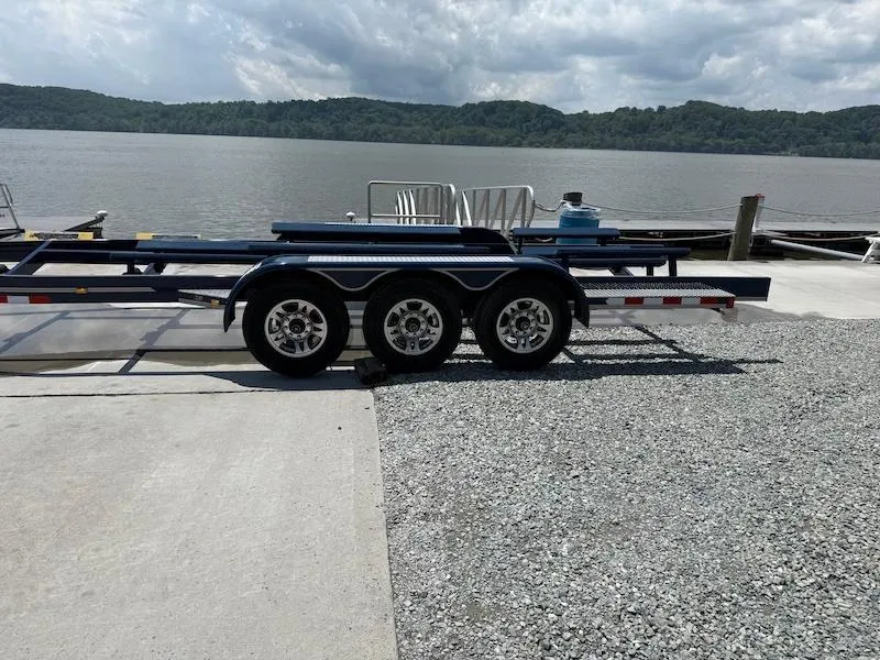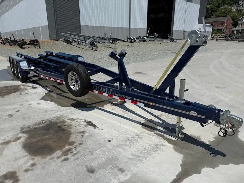 This Heritage tri-axle trailer is rated at 18,000 lbs GVWR. Steel trailer with blue powdercoating. Originally belonged to a boat owner with a 2013 Cobalt 336. The trailer is in nice condition and road ready with 4 brand new tires and it has passed the State of Maryland Inspection. One bunk could use new carpet, the rest are good.