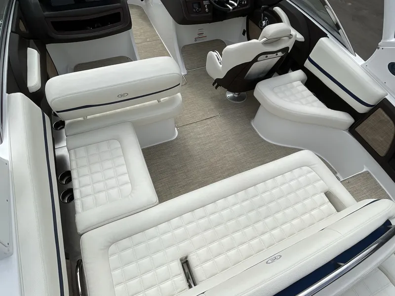 Feel the rhythm of the waves as you enjoy your favorite tunes through the premium sound system with transom speakers & remote. Whether you're dancing on the deck or relaxing in the cabin, the crystal-clear sound quality will envelop you in an audio paradise. Step onto the sea grass interior that exudes sophistication and comfort. The port sunpad filler cushion invites you to stretch out and soak up the sun, while the thoughtfully designed layout ensures ample space for relaxation and socializing.