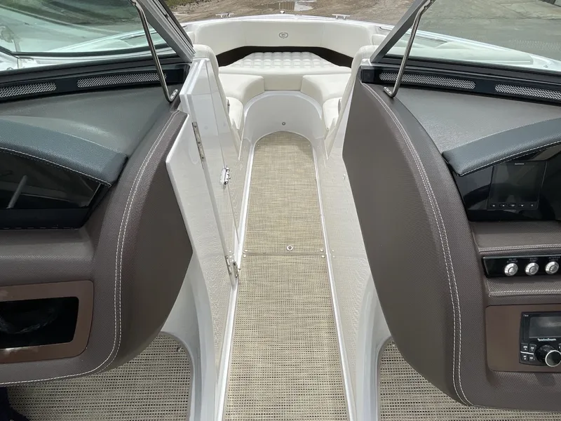 Feel the rhythm of the waves as you enjoy your favorite tunes through the premium sound system with transom speakers & remote. Whether you're dancing on the deck or relaxing in the cabin, the crystal-clear sound quality will envelop you in an audio paradise. Step onto the sea grass interior that exudes sophistication and comfort. The port sunpad filler cushion invites you to stretch out and soak up the sun, while the thoughtfully designed layout ensures ample space for relaxation and socializing.