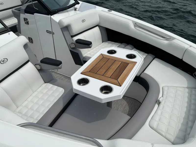Bow & Cockpit tonneau covers, dinette table with multiple receptacles, and center bow cushion insert for extra versatility and comfort