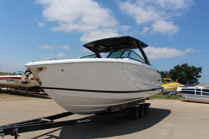 The 2025 Cobalt R33 is the ultimate expression of luxury, size, and performance in the R-Series lineup. At over 33 feet long with a 10'6" beam, the R33 blends the convenience and handling of a bowrider with yacht-class amenities. Equipped with twin Volvo Penta V8 engines, Garmin glass cockpit displays, and premium luxury finishes, the R33 is designed for entertaining, watersports, and extended cruising.