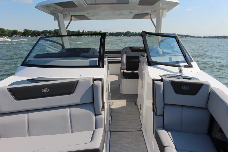 Continuing the Cobalt theme of luxury materials and unmistakable quality, the R35's finely tailored upholstery covers an enormous amount of seating in an array of modern colors and textures from stem to stern. The ergonomic helm features dual Garmin glass cockpit touchscreens, while the passenger area offers such amenities as a stowable oversize teak table and an ingenious Freezer/Fridge combo unit that gives you both functions in one space-saving package.