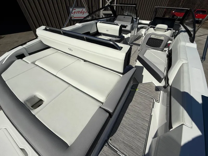 Dressed in a classic Navy and White exterior with a sporty swim platform accent, the R4 exudes timeless elegance. Inside, the Summit/Frost interior provides a clean, modern aesthetic with plush seating and Sea Grass floor covering for all-day comfort. The Aft-Facing Rumble Seat adds versatility, letting you soak in the views in style.