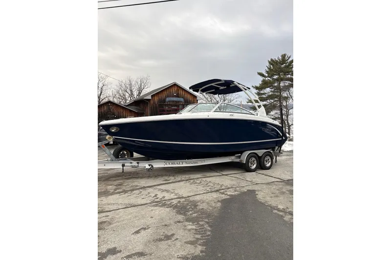 Nice one owner R5 that we sold and serviced since new. 380hp Volvo Penta DuoProp with 420 hours. Includes Solid Hull graphics in Navy with White Edge stripe. Options include Aluminum arch with bimini, Bow/Cockpit Covers, Premium Sound with Transom Speakers, Dual Batteries with VSR, Del Mar Sport Seat, Sea Grass Flooring, Docking Lights, Led Interior accent lighting, Bow Filler Cushion, Port Sunpad Filler Cushion, Woodgrain dash, and Phoenix Aluminum custom Trailer!